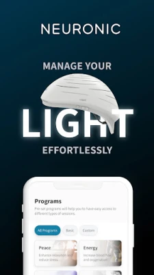 Introducing the Neuronic App, an app to manage your Neuronic Light device's experience, suitable for use both in clinics and at home. The app offers a variety of pre-set protocols that you can start with one click on your helmet to optimize brain wellness.